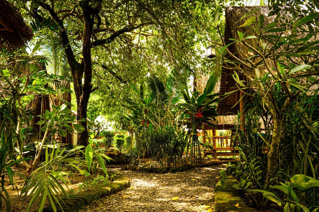Private bungalows in a lush garden setting. Quiet, clean, and close to everything.